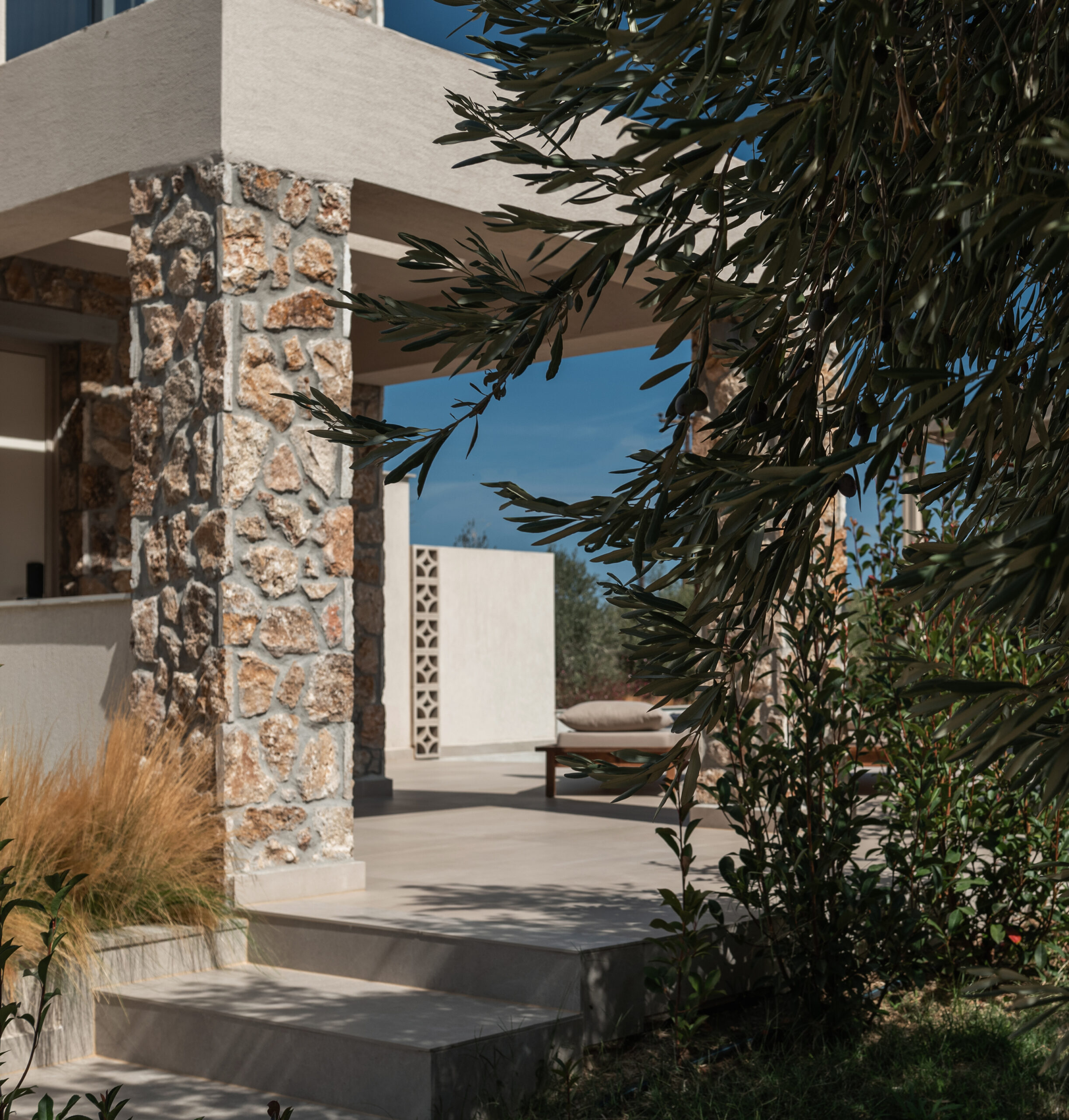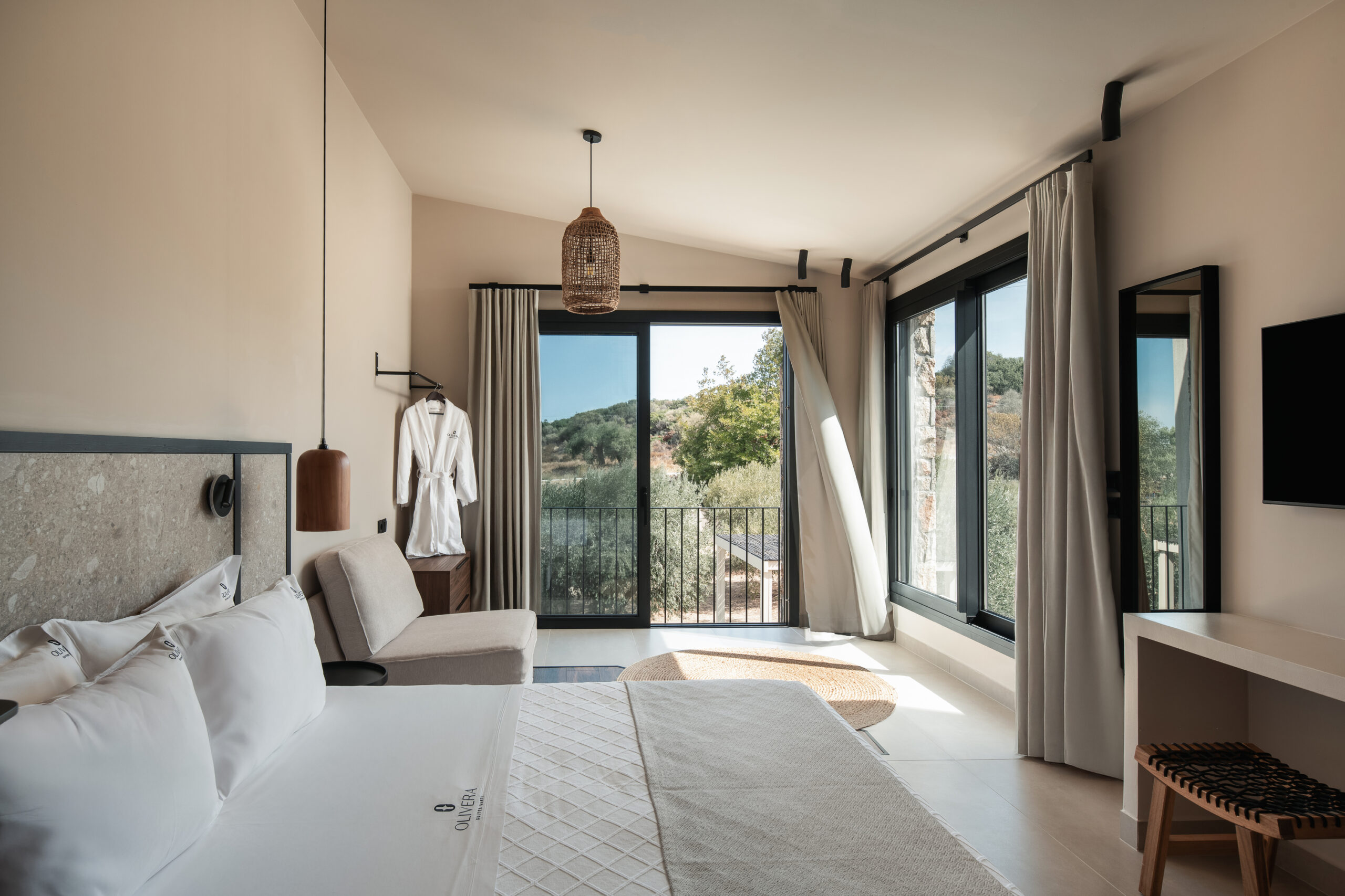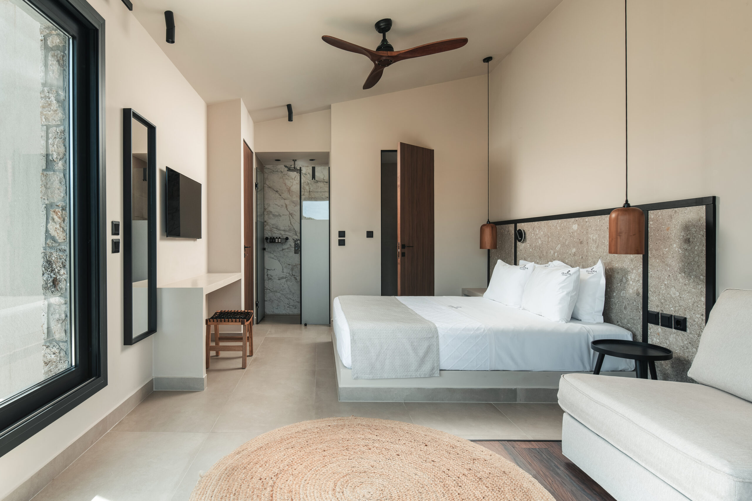 On the upper floor of the suite, you can wake up rested on a king size bed and enjoy the serene view of the olive grove around in the sitting space. This floor is also equipped with another WC and shower.