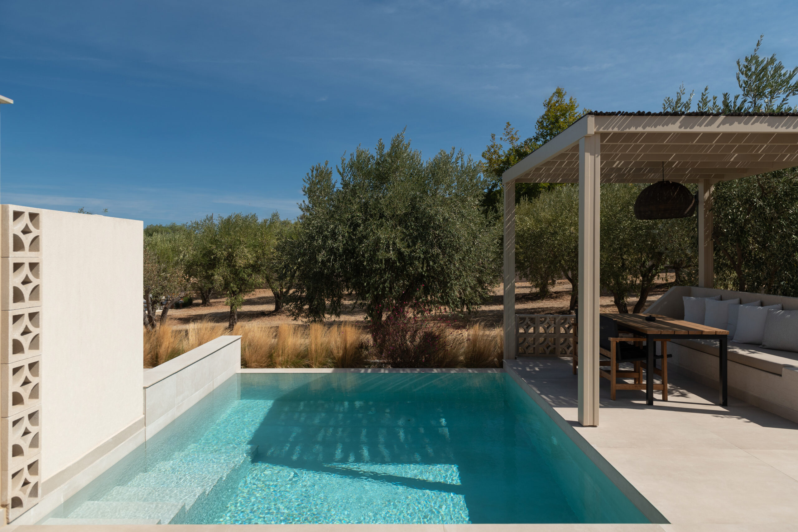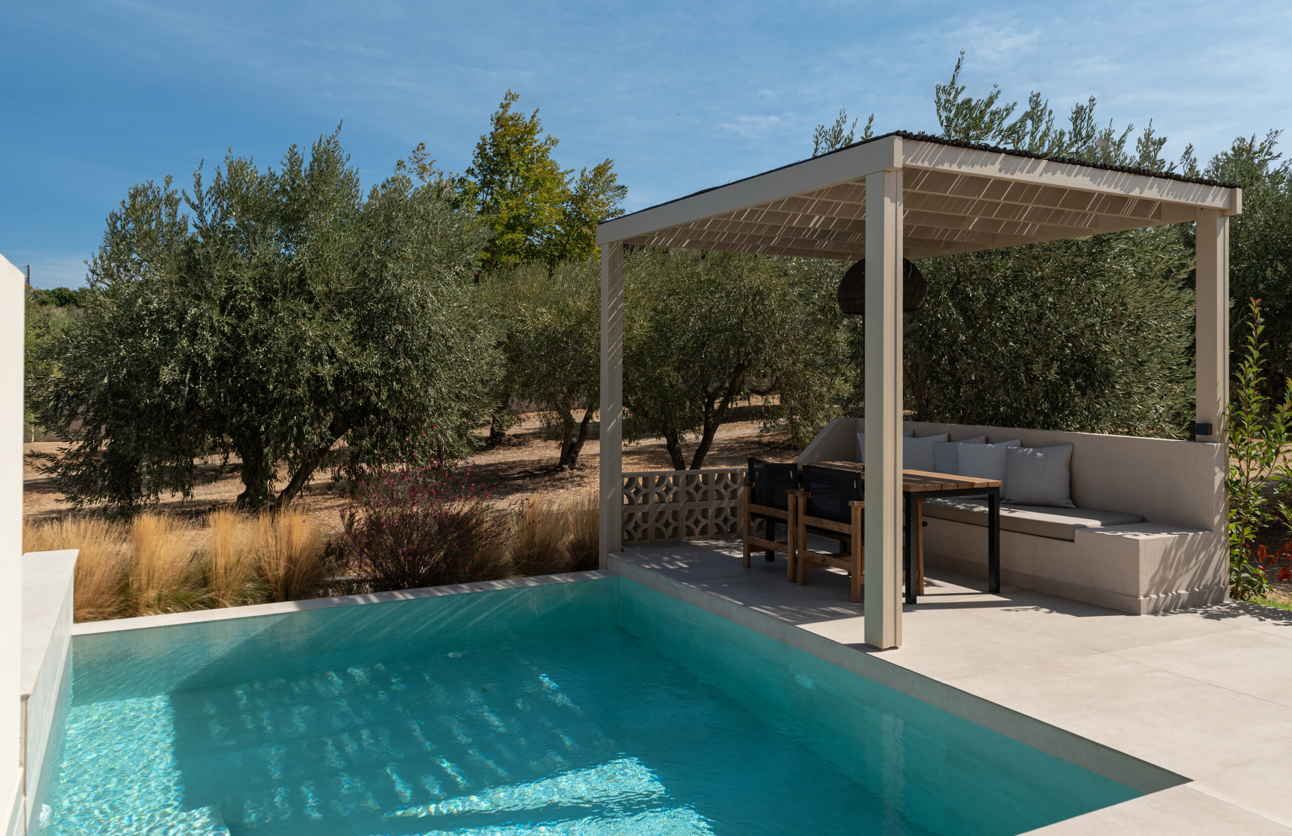 On that floor, you can access the private pool from the balcony, which is furnished with a dining table set underneath a pergola for more privacy. You can also relax on the sunbeds by the pool and enjoy carefree moments.
